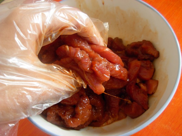 新鮮豬肉洗凈,切小塊,放入料酒、生抽、老抽、白糖、、食鹽、味精調味,攪拌均勻,腌制2小時,備用。