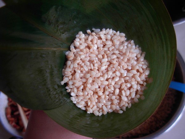 取一片粽葉,將粽葉交錯疊好,葉梗在外,粽葉光滑面朝內,于1/3處折成漏斗狀,填入2匙糯米。