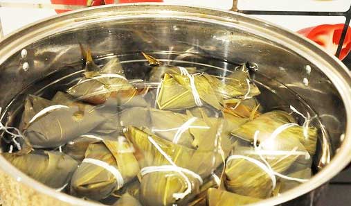 電熱鍋內加入足夠的清水,放入包好的粽子,蓋上鍋蓋,打開電熱鍋三個加熱開關,等水沸騰后,關掉一個加熱開關,使用兩個加熱檔位繼續煮1個小時左右。