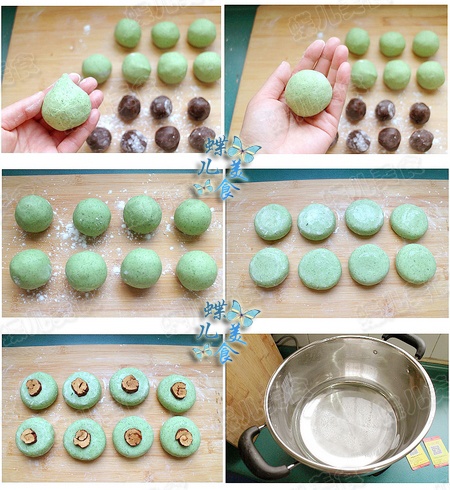 10.把艾葉粉團和豆沙餡分別分割成8等份,并搓圓。