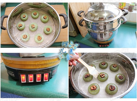 19.把做好的艾葉餅坯放到鋪了打濕屜布的蒸籠上。