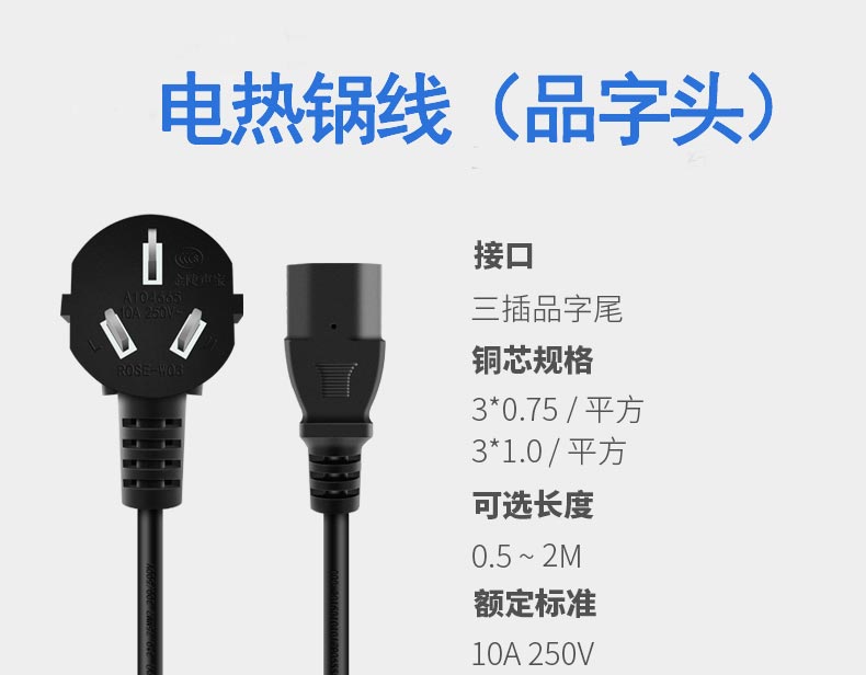品字頭電熱鍋電源線,國標線材,應用廣泛,可用于電熱鍋、電煎鍋、電水壺、電腦主機等。
